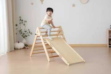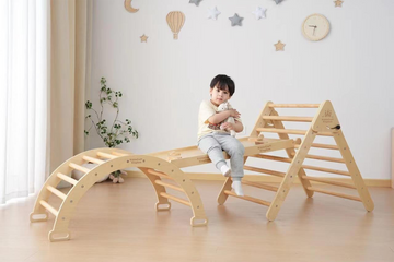 🧗♀️ Includes 7 play features in one — Pikler Triangle, Climbing Arch (which also doubles as a rocker), and a Double-Sided Ramp with one smooth slide and one climbing surface.